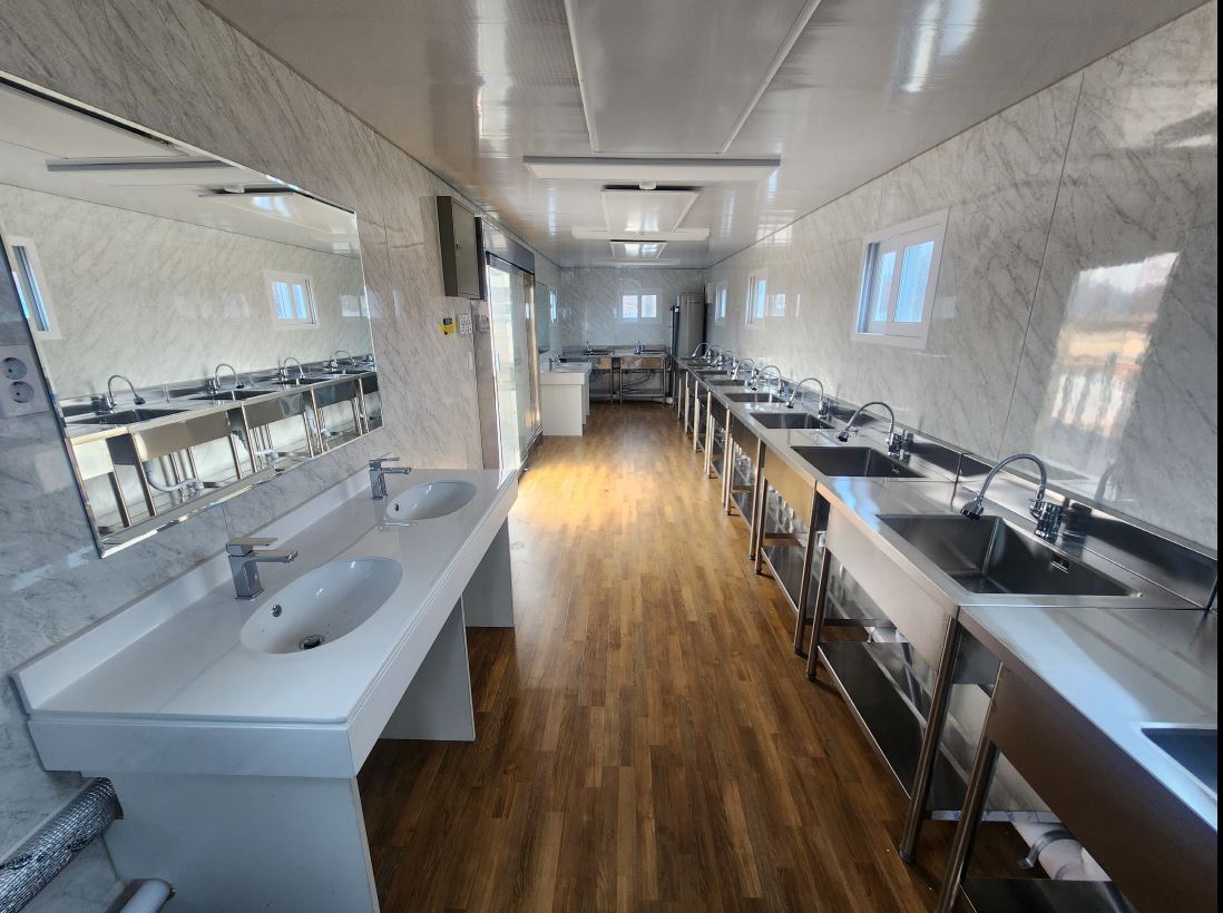 징크판넬의 견고함과 목재의 따뜻한 감성을 조화롭게 적용하여 야외에서도 주변 환경과 자연스럽게 어우러지는 미려한 외관을 완성했습니다. 현장 어디서든 쾌적하고 위생적인 세척 공간을 제공합니다.